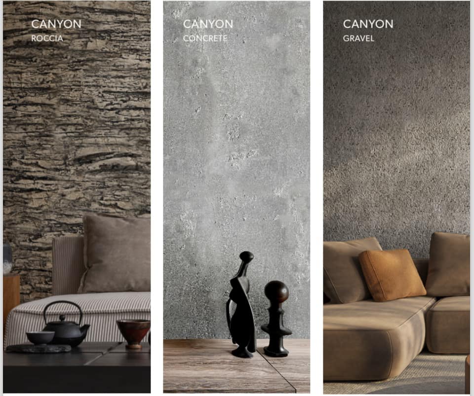 A Canyon felülete matt, strukturált, a fényben pedig gyönyörűen kiemelkedik a textúra – így a fal nemcsak háttér, hanem a tér egyik meghatározó design eleme lesz.